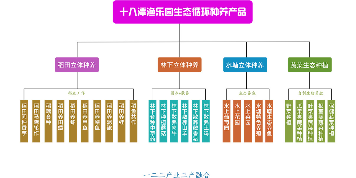 十八潭渔乐园以底蕴深厚的中国传统鱼文化创新为引领,以“生态农业种养 + 休闲旅游服务 + 互联网电商销售”线上线下结合为模式,坚持生态循环农业、创意农业、渔业体验一体化。以稻田养鱼为基础,以浑水摸鱼、抓泥鳅、挖黄鳝、钓青蛙、钓龙虾、钓甲鱼、捡田螺、稻田抓鱼、扳罾子捕鱼、定罾子诱鱼等传统捕鱼体验产品和亲亲鱼疗、吸奶鱼、喂鱼、赏鱼等现代鱼文化产品为卖点,并配套土菜手工坊、私家自助厨房、野炊烧烤基地、乡村客栈等打造广州乃至全国第一家“传统鱼文化主题乐园”。