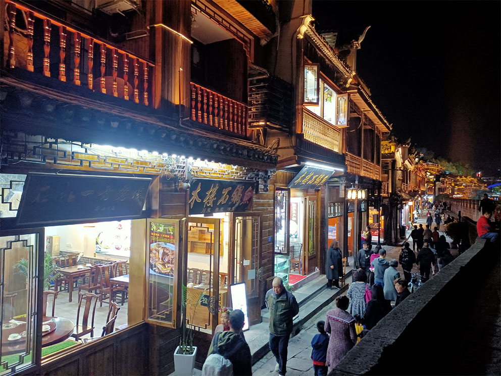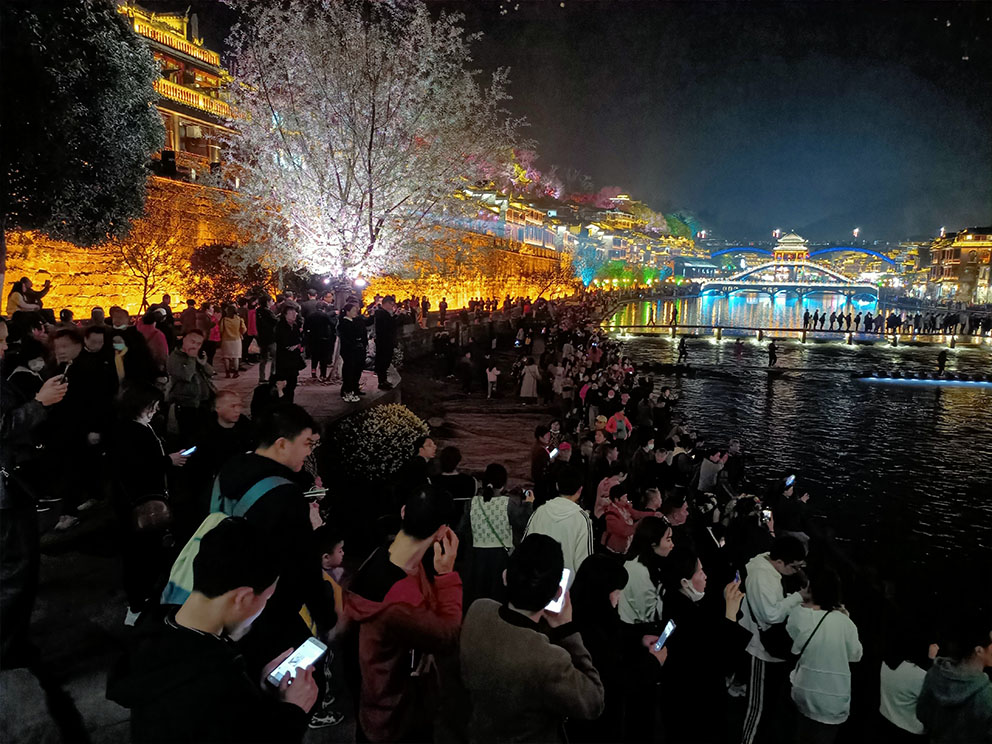 2021年春节刚过去不久,凤凰古城旅游迎来爆发式增长,在五彩缤纷的夜景灯光下,古城的夜色如画,游人如织,络绎不绝。